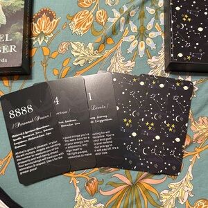 Beautiful Angel Number Oracle Cards with mystical design. Only used a couple of times, all cards in like new condition, as well as box. Detailed descriptions of what different Angel numbers mean! Very interesting and fun.m, to do alone and with others!