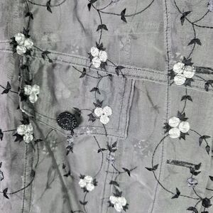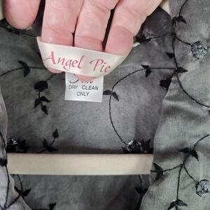 Elevate your wardrobe with this dreamy, vintage Angel Pie sheer silk jacket featuring exquisite white floral embroidery on airy gray mesh. Cropped for a dancing silhouette and adorned with standout black floral buttons, it's a festival favorite and a street style must-have for artistic souls. The luxe feel and lightweight silk ensure comfort layered over tanks or dresses. No flaws seen—just pure, rare "fairycore" energy. Wear it open for effortless edge or buttoned up for retro romance.
