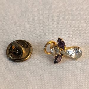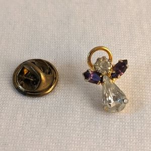 Goldtone angel pin with "diamonds", amethyst wings and halo. Very sweet! About 5/8" long by .5" wide.