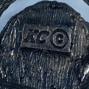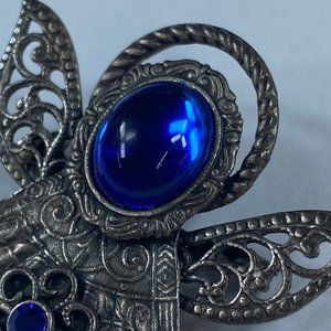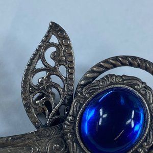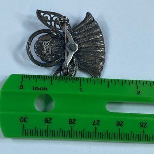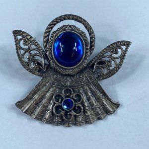 Angel Pin Brooch KC Dark Silver Tone Blue Stones Floral Accent Rhinestone Metal Construction. Filigree details. Antiqued Silver Color. Birthstone, Blue Color.
