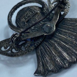 Angel Pin Brooch KC Dark Silver Tone Blue Stones Floral Accent Rhinestone Metal