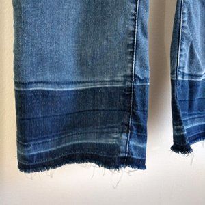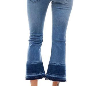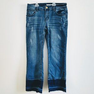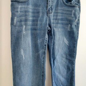Medium-wash denim by Angel + Premium in a cropped ankle/capri length with a release hem detail. Slight distressing on front. Curved through the hip for a comfortable fit and no waist gapping. Stretch denim. Super cute denim style.