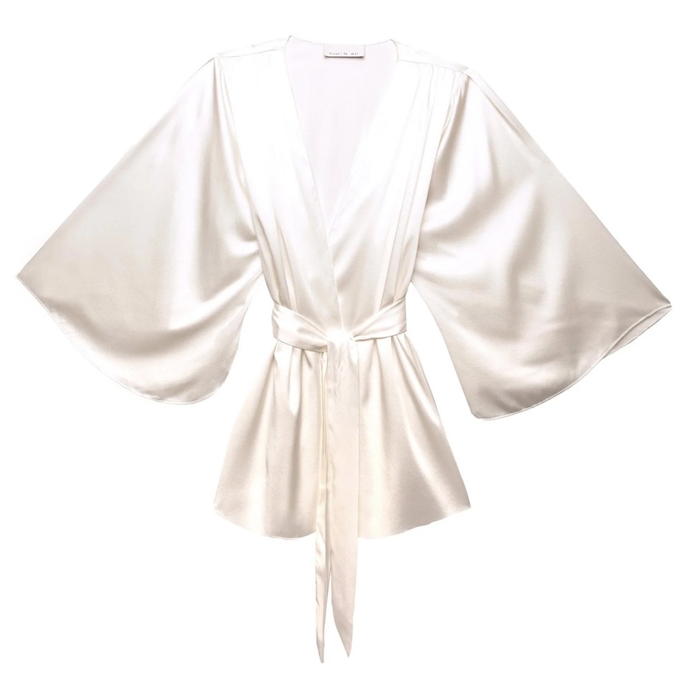 luxe 19mm silk charmeuse. Features a playful fit with wide sleeves. Wraps across the body and is secured by a sash. 92% Silk & 8% Spandex