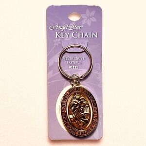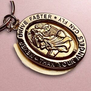 This New Old Retired Stock Angel Star Key Chain is in excellent preowned condition. The oval Angel relief charm is suspended within a ring that is engraved with the saying, “Never Drive Faster Than Your Angels Can Fly.”