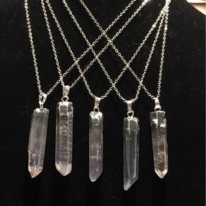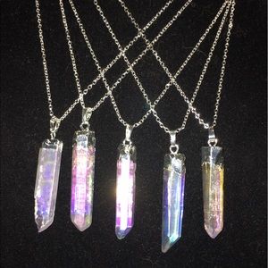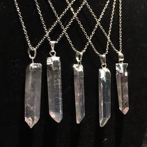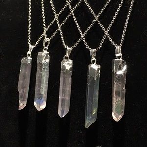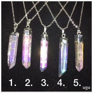Angel Titanium Druzy Quartz Crystal point w/silver plated accents and 16-18" silver sparkly chain. I took photos with and without a flash so you could see the iridescence colors of each necklace and stone because each stone has a different tone to it in different lighting's there's purple tones yellow tones and blue tones! Simply gorgeous and let me know if you want to swap out the chain for a silver stainless steel choker or a brown black or white braided genuine leather cord, it is $10 extra.
