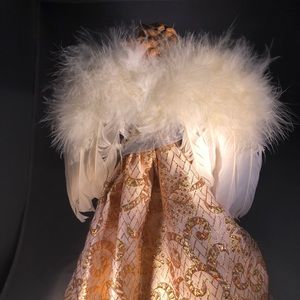 Gold angel tree topper with fur around collar and coat sleeves. . Stand approximately 13 inches tall. The inside cone is approximately 9 inches deep. The wings are feathers. The hands and face are ceramic.