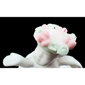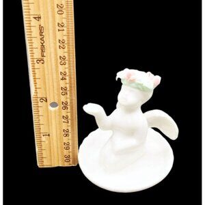 This charming vintage porcelain angel jewelry trinket dish, has a delicate pink rose crown and intricate detailing. Ideal for collectors or as a thoughtful gift.