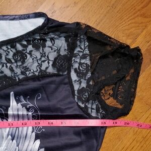 This beautiful print shirt is comfy and cute! Cap sleeves made of lace and lace detailing across the top are gorgeous ๐