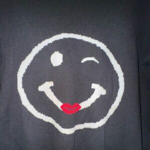 Stylish black sweater featuring a playful smiley face design. Perfect for casual wear. 55% Cotton, 45% Acrylic