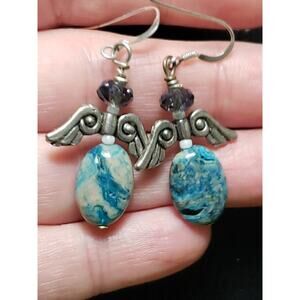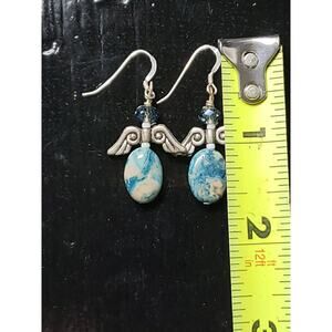 These are beautiful angel with wings dangle earrings. They have beautiful blue natural stone, maybe an Ocean Jasper, shaped in an oval for the body, with silver tone angel wings and dark blue iridescent glass beads as the head. They drop about 1.5 inches on "925" stamped sterling silver hooks. There are natural crevices in the stones, they are not broken (see pictures). These are pre-owned with minor wear, but still beautiful and in good condition.