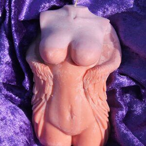 Unique nude candle with angel wings. Features pink and peach tones. Made with soy wax and help wick for a clean burn. Burn or keep as decor.