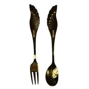 Two piece angel wings gift set - Child size winged spoon and fork. New in box. Gold plated stainless steel. Packaging has a tear on front. Reads: A dream flew out of the skylight. Due to light & screen variations, colors may vary slightly from the images