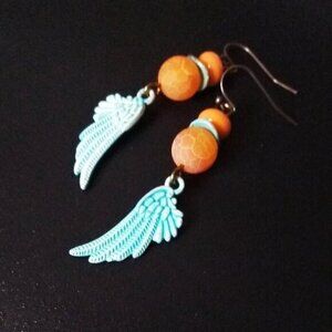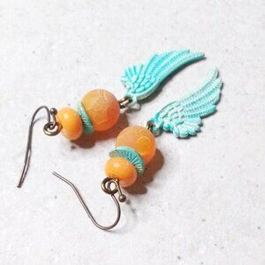 Colorful, vibrant - combining hand painted elements with semi-precious stones! Stunning juicy orange beads [flat donut ceramic beads + frosted Agate Globes] create a beautiful contrast to the verdigris turquoise patina painted angel wings and wavy spacer bead. If you love to wear earrings that stand out and get attention - you will love wearing this pair! I guarantee loads of compliments, questions and probably some male whiplash here and there.