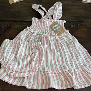 Charming baby outfit with pink and white stripes. Includes matching bloomers. Soft and stylish for little ones.