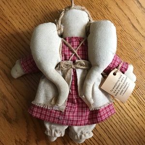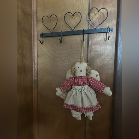 Sweet angel doll, can hang, too Xmas or country theme decor Linen like fabric Circa 1980s still has store tag 😇 Little heart metal key holder? 15”x4”