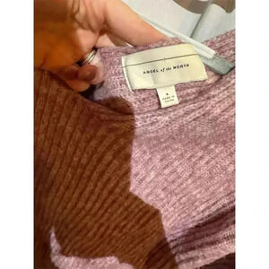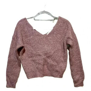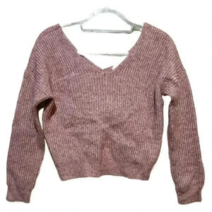 Keywords: Angel of The North, pink sweater, women's pullover, twist back, ribbed texture, V-neck, cozy sweater, casual wear, brunch outfit, pre-owned sweater, size XS, women's fashion, warm sweater, stylish pullover, comfortable knit.