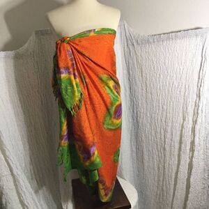 Orange with Green and Purple "Aloha" flowers swim sarong/cover-up. Fringe detail. Has a small imperfection near the tag as seen in picture. Pre-owned in overall good condition. Please refer to pictures for best description and condition verification.