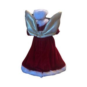 Used 10" angel tree topper - beautiful angel wearing a red velvet drss with gree lace inset, white fur around sleeves, hem, collar and hat, gold wings. Hands and head are breakable. Unfortunately, the lights stopped working this year. I'm not sure if this can be repaired, I haven't tried replacing the bulbs or fuse. Otherwise, the angel is in excellent condition.