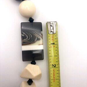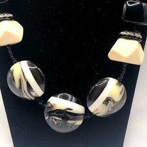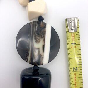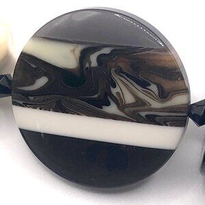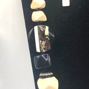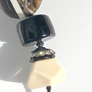 From her iconic Giuggiù collection, this set embodies the bold, sculptural aesthetic that made Caputi a favorite among stylists, collectors, and museum curators alike. Handmade in Italy, it showcases oversized geometric resin beads in black, ivory, brown, tan, and cream, accented with subtle rhinestone sparkle and a distinctly artistic flair.