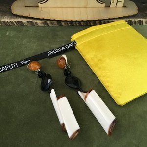 This pair of new never worn clip earrings from Angela Caputi are an Ivory colored resin highlighted in a tortoise shade. The tops are an amber colored piece. In between there are black faceted pieces. The measurements are approximately