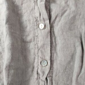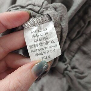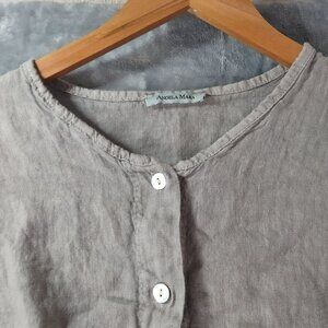 This Angela Mara women's button up top in size Medium offers a relaxed oversized fit with a distinctive lagenlook silhouette. Crafted in Italy from breathable 100% linen, it features a stylish tie front, roll tab ruched sleeves, and natural texture perfect for elevated everyday wear or the quiet luxury trend.
