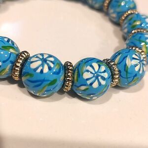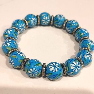 Angela Moore Classic Beaded Stretch Bracelet in Capri Blue. Lovely hand-painted floral beads strung with silver-tone metal ridged spacers. One size.