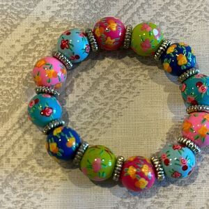 Angela Moore Women’s Multi Color Floral 14mm Beaded Bracelet. Angela Moore designs are hand painted beads in themes inspired by favorite colors, fun trends and causes they care about. This Classic Bracelet has twelve 14mm beads with a flat silver bead in between. The classic bracelet measure 7 1/2" and are one size fits most. Stretches to put on.