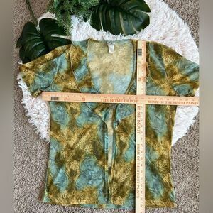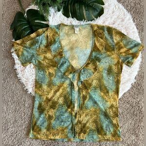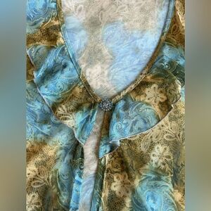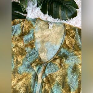 Angela USA Y2K Tan Blue Gold Floral Scroll Ruffle Open Front Button Blouse Sz M