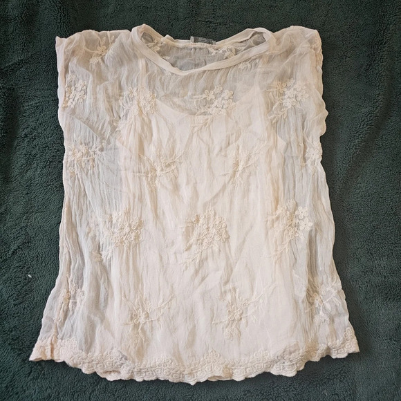 Angela moda silk Italian blend floral embroidered cream color sheer tee Small
