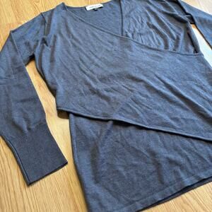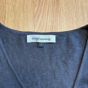 Good condition charcoal gray sweater from Angelcare Maternity, size L. Soft and stretchy with a wrap style that can transition from maternity to nursing. Long sleeve, V neck. Overall has very little wear on the fabric, but there are a couple of minor snags (see photos).