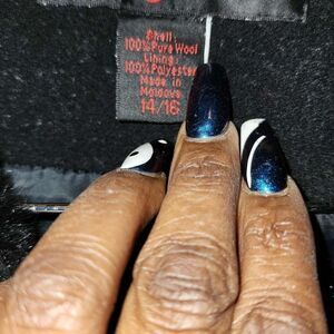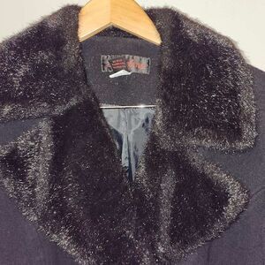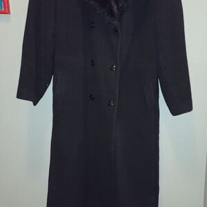 100% pure wool fully lined black maxi coat with faux fur collar and lapel. Double breast button closure
