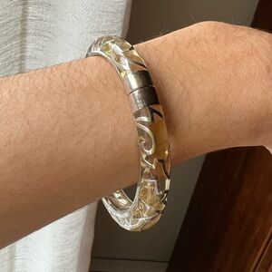Clear Angelique de Paris bracelet. Silver tone overlay which is slightly tarnishing. Bracelet bangle with magnetic closure. Fits a small to average sized wrist. Amazing summer or resort season wrist accessory. So easy to put on and off and easy to pack! Can also be purchased with other Angelique de Paris bracelet posted.