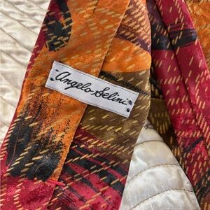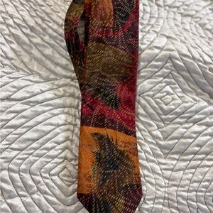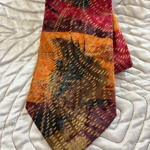 Vibrant tie with an abstract design in red, orange, and brown. A bold accessory for any wardrobe.