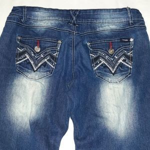 These are cute jeans. They're permanently cuffed crop style, with 2 buttons on the fly and blinged out designs on the butt pockets. They're in great preowned condition. Measures unstretched waist 29", inseam 22", rise 7.5". Thanks for looking!