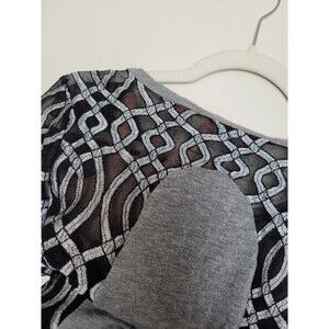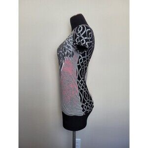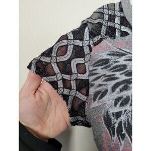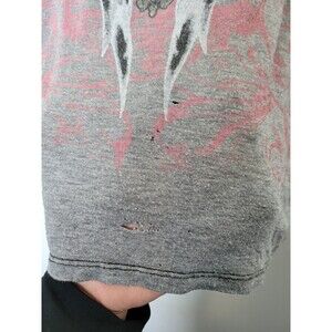 Super cool tee shirt in a Goth Grunge style. Graphic she-devil print on front with a sheer mesh metallic panel and sleeves. Very cool, very Gothic, very fun. Condition is okay, there are some small holes on front. see photos. adds to the distressed Thrashed vibe. No size tag. measures like a small to medium. Approximately 23 inches long 16 inches underarm to underarm laid flat.