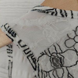 Angels & Diamonds Women's Tank Top Blouse Size Small, White Black with Fleur De Lis Graphics and Scoop Neck.The back is sheer lacy type material. The edges are distressed, the front has a semi-textured with distressed fabric. See pics - I tried to get close ups of texture. Very original looking top. Please compare yourself to measurements in pics.