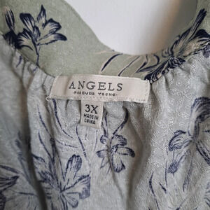 Angels Green Blue Tropical Flower Button Up Square Neckline Puff Sleeve Top S 3X