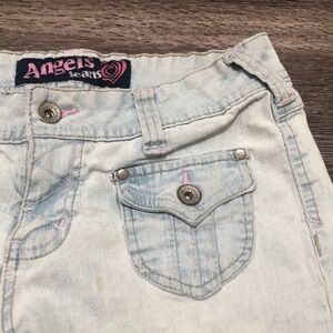 Used but in good condition. Please see all photos carefully as there is staining on the front. If stain treated these should come out. Y2K 2000s style with pink details and two button close pockets on the front. These say size 7 but look very small so I included measurements. Feel free to send offers and questions