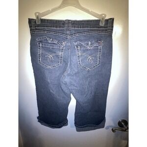 Elevate your denim collection with these Angels Jeans Capris in a beautiful blue color. The solid pattern with embroidered accents and cuffed hem add a touch of personality to these regular fit, low rise capris. The 5-pocket design, including a coin pocket, provides ample storage space while the zipper and button closure ensure a secure fit. Made from a blend of polyester, spandex, ramie, and cotton, these capris are machine washable for easy care. The fabric type is denim and it has a dark wash, making it perfect for any season. These capris also feature stretch and comfort, ensuring a flattering fit.