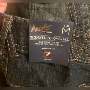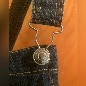 Stylish dark blue denim overalls. Features adjustable straps and side buttons. Perfect for casual wear.