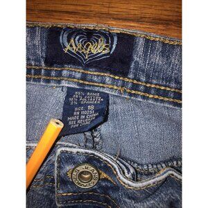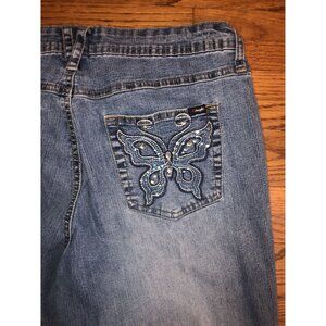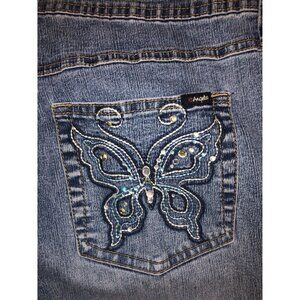 Jeans that scream, "Yes, I have a butterfly on my behind, and it's fabulous." These Angels jeans blend comfort and style with a touch of whimsy. Wide legged, in good condition.