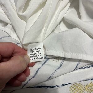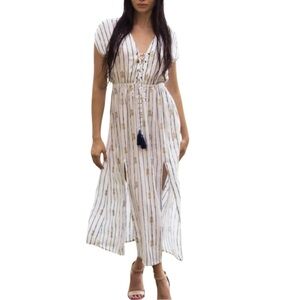Angels by the Sea Loha Hawaiian Dress Pineapple white and navy. Lace up front with decorative tassels. Side slits. Deep v neck.