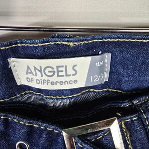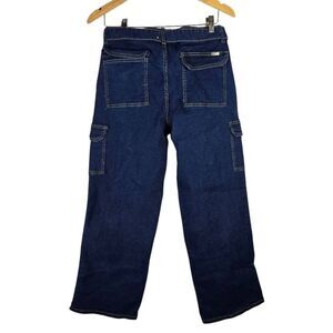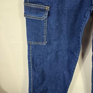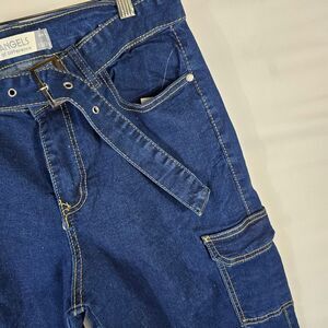 Angels Jeans cargo pants in dark wash denim with contrast stitching. Includes matching denim belt and multiple pockets—perfect for casual wear or outdoor adventures. Features two large side cargo pockets and a relaxed fit for comfort and style.