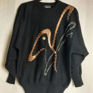 Angenie Women's Black Pullover Knit Graphic Jeweled Sweater L