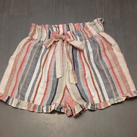 Angie 100% Cotton High Waist Stripe Shorts with Wide Band Elastic Waist, Non-functional Tie Bow, Side Pockets, and Ruffle Hemline. Excellent Condition.