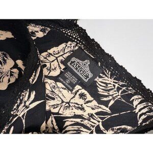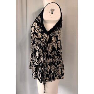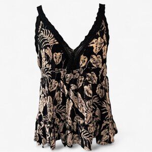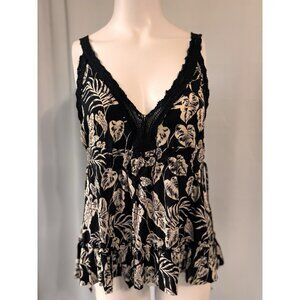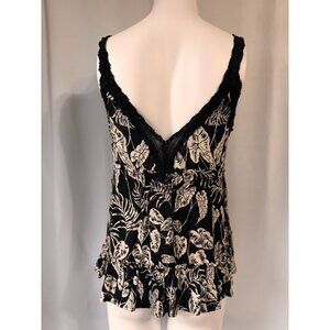 Angie Babydoll Cami Top S Black Cream Leaf Print Ruffle Peplum Adj Waist NEW