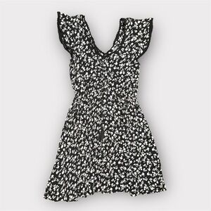 Angie Black / White Floral Flutter Sleeve V-Neck Tassel Tie Mini Sundress- Small