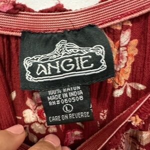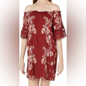 Bohemian red floral dress with off shoulders sleeves adorn with crochet at hem. Lightweight, can also be worn as a tunic top and it will still look cute. Hand wash cold.