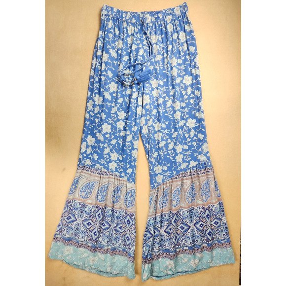 Angie Boho Flare Pants M Blue Multi Bell Bottom Pull-On Elastic Waist Festival