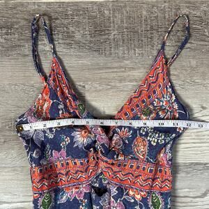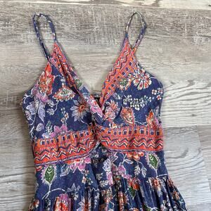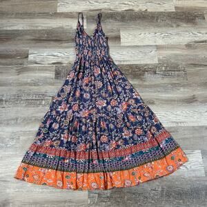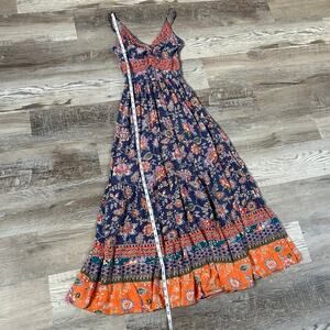 Angie Boho Maxi Dress Navy Floral Print Tiered Skirt Tie Front Festival S